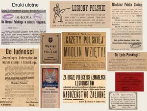 Druki ulotne – ponad 900 druków ulotnych z lat 1914-1918 wydawanych głównie na ziemiach Królestwa Polskiego: odezwy polskich organizacji niepodległościowych i partii politycznych, a także rozporządzenia niemieckich władz okupacyjnych, afisze, plakaty, kartki żywnościowe, zaproszenia, bilety i karty wstępu.